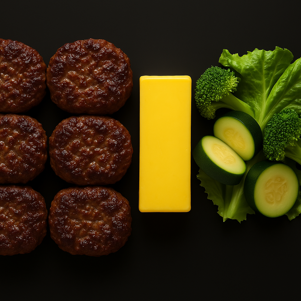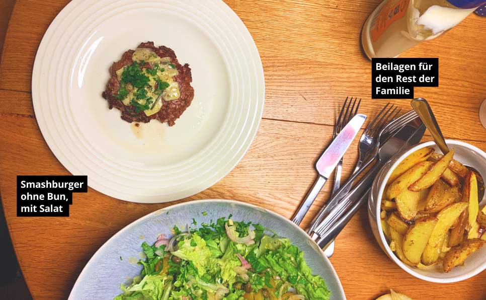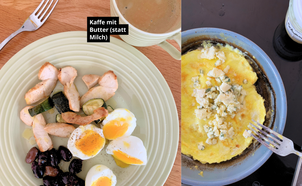 Das sind ungefähr 250 g Rinderhackfleisch + 100 g Butter am Tag. Mit diesen Lebensmitteln bekommst du einen Großteil deiner täglichen Kalorien im richtigen Protein-Fett-Verhältnis. Ergänzt du noch eine gute Portion Gemüse wie Zucchini, Brokkoli oder Salat, liegst du komfortabel innerhalb deiner Keto-Makros (angenommen du brauchst wie ich ca. 1600 kcal pro Tag).