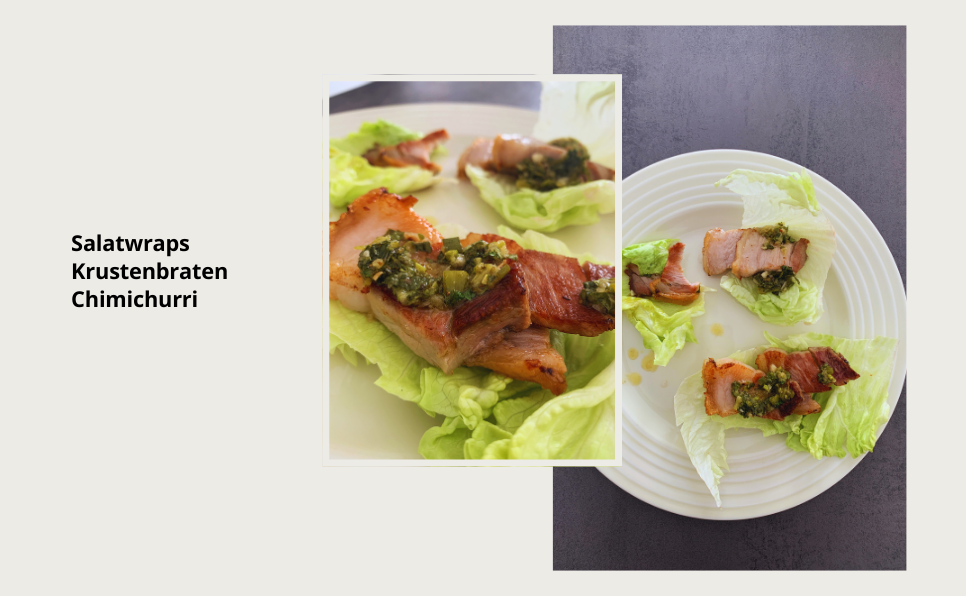 Sonntags Krustenbraten für die Gäste – montags Wraps für mich. DAS ist Meal Prep. Und es schmeckt, als hätte ich mich in der Küche richtig angestrengt. Man kann auch jedes andere Fleisch nehmen – Hackfleisch, geräucherter Schweinebauch, Bacon, Steakreste. Statt Kräutersauce geht auch einfach ein ordentlicher Klecks Mayonnaise (ohne Zucker).